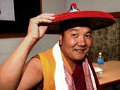 | All Smiles: Lama Tashi in a traditional Assamese japi in Guwahati on Thursday. Picture by S.H. Patgiri |