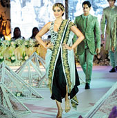 Designer Anamika Khanna on the verge of creating a fashion experience never seen before, appeared like an apparition in a contemporary rendition of the Khara-dupatta. Sonam Kapoor looked stunning floating in a gold Anamika ensemble.