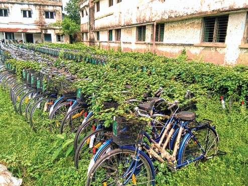Weeds have covered around 2,000 bicycles of the "Sabuj Sathi" scheme of the Bengal government as the two-wheelers are being kept at the ground of Maharaja Jagadishnath High School in Raiganj for the past eight months. Sujit Pal, the headmaster of the school, said on Monday that the block administration of Raiganj had kept the cycles on their ground and also in some of the rooms.
