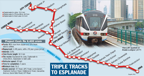 As per the revised LRT scheme, called Elevated Mass Rapid Transit System (EMRTS), prepared by the Consulting Engineering Services, high-speed trams will ply on elevated roads on three routes, all terminating at Esplanade.