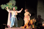 There is puppetry, mime, a folk flavour and lighting by Joy Sen. The songs are written by Mitra and scored by Soumitra Ray of Bhoomi. Songs like O akash o parabar, ashim, apar, bolo ebar ami kobey hobo amar are likely to linger beyond showtime. The locale is the rural countryside where a theatre troupe is performing this pala written by Ishwar Madhav Chandra Naskar. Here it is not Hanuman who goes to rescue Sita but Hanumati, Hanuman’s girlfriend. Because Madhav Chandra felt that women’s woes cannot end without the direct involvement of women. Hanumati leaves for Lanka on the fabled Mayurpankhi boat. As a magic talisman she has a ring with which she hopes to win Sita’s confidence by passing it off as Rama’s. The ring soon becomes the most sought symbol of freedom and love.