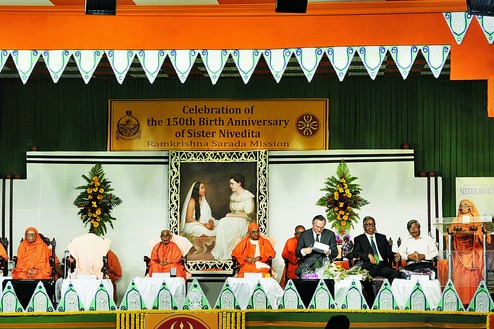 (From left) Pravrajika Bhaswaraprana, the principal of Ramakrishna Sarada Mission Vivekananda Vidyabhavan; Pravrajika Ajayaprana, the vice-president of Sri Sarada Math and Ramakrishna Sarada Mission; Swami Vagishananda, the vice-president, of Ramakrishna Math and Ramakrishna Mission; Brian McElduff, the Irish ambassador to India; Mahendra Kumar Jalan, chairman emeritus of the Keventer Group; Ajoy Kumar Ray, the director of IIEST, Shibpur; and Pravrajika Amalaprana, the general secretary of Sarada Math and Ramakrishna Sarada Mission, at a public meeting at the Bagbazar Sarbajanin ground on Sunday to celebrate the 150th birth anniversary of Sister Nivedita.