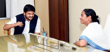 Calcutta: Hardik Patel, the Patidar leader from Gujarat, on Friday hailed Mamata Banerjee as "Lady (Mahatma) Gandhi", drew parallels between her and Indira Gandhi and pledged full support to the Bengal chief minister.