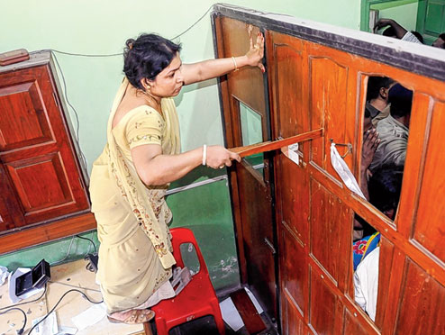 | Reshmi Dey in action at Christ Church school and (above) the principal’s room after the vandalism |