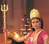 | She’s enacted almost everything else. So Debashree Roy has decided to try out something different on big screen. “I have never played the role of a goddess before. This is challenging,” said the actress, decked in goddess Durga’s attire during the shoot of a yet-to-be-named film at Technicians II. Directed by Swapan Saha, the film also stars Jishu Sengupta and Rachana Banerjee. Picture by Pradip Sanyal |