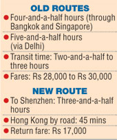 The flight to Shenzhen will take three-and-a-half hours. Add half an hour for formalities and 45 minutes for the bus ride and a traveller will still reach Hong Kong in less than the time it takes to fly via Delhi.