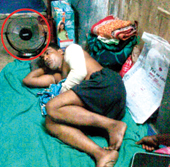 | On the floor at SSKM’s Curzon ward, medicines are not the only things being provided by the patient’s family. They have had to buy a fan (circled) for Rs 800 because there is none anywhere near Joypada Mondal, 45. “He would have died of the heat had we not bought it,” Bishnupada said about the plight of his younger brother, in hospital with a fractured skull and arm. A plastic bag to carry diagnostic reports, lying behind the patient’s back, says ‘Yes we care’. |