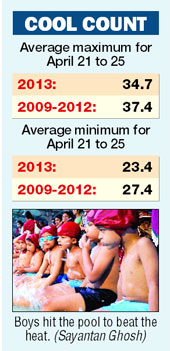 The average maximum and minimum temperature from April 20 to 24 this year had been around 34.5 degrees Celsius, almost three notches less than the average for the same period between 2009 and 2012. In 2009, the maximum temperature had crossed the 40 degree-mark on four days between April 21 and April 25.