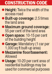 The rules do not impose any restriction on the floor-height of the buildings, unlike in Salt Lake. The height of a building, however, has to be commensurate with the width of the access road. In Salt Lake, the height must be proportional to the size of the plot.