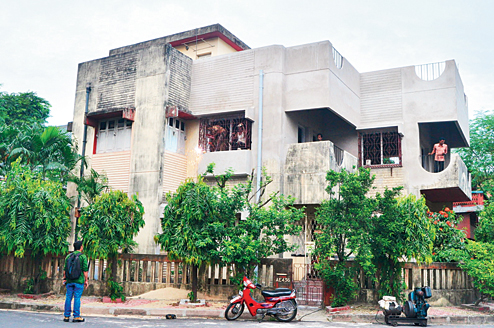 Officer-in-charge of Bidhannagar North police station, Santanu Koar, checks the suitcase at AE 436 around 4pm. “I noticed the bag on a heap of sand on the premises of my house around 2.45pm and alerted our councillor Swati Banerjee, who in turn alerted the police,” says houseowner Manasi Sanyal. At that time, around eight labourers were working on the second floor of the building.