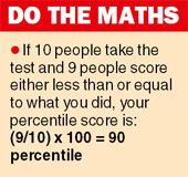 An individual’s percentile is calculated by dividing the number of examinees who have scored less than him or her by the total number of candidates. The result is then multiplied by 100 (see chart).