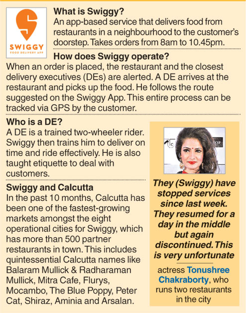 Swiggy, one of the more popular app-based food delivery services in India, has pressed pause in Calcutta, triggering sighs and oh-nos from foodies who love to binge on their favourite restaurant food sitting in the comfort of their homes or at work.