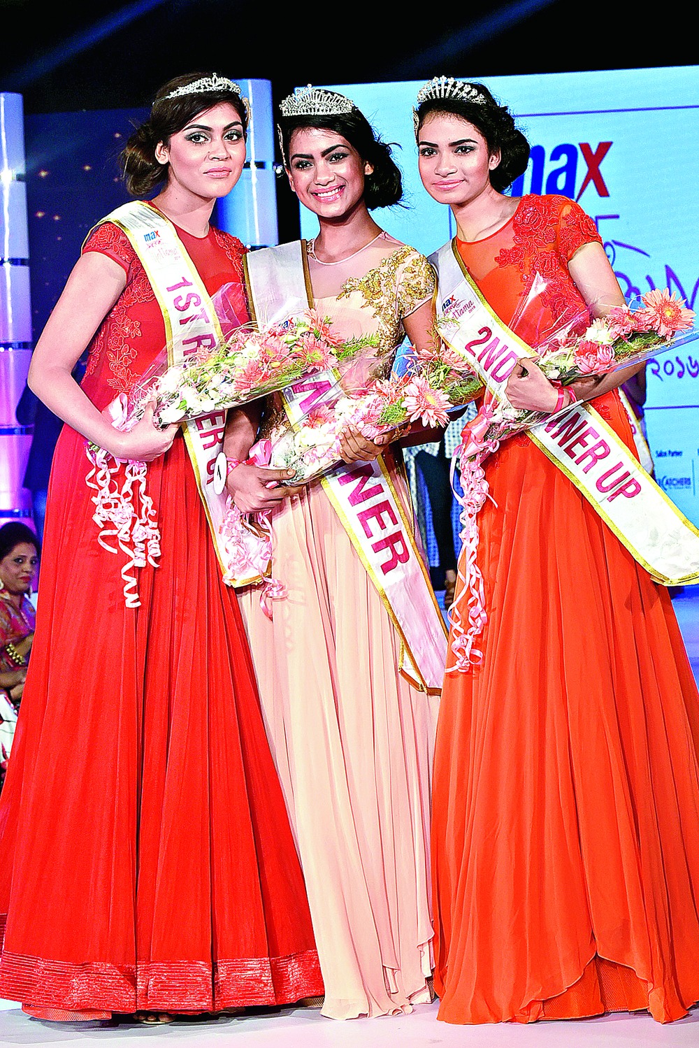 For Chinsurah girl Mouli Haldar, it was a super Saturday as she was crowned Max Sananda Tilottama 2016 in a glittering ceremony at The Lalit Great Eastern. "This is a huge achievement. Even if I hadn't won today, I would still be a winner because before this I didn't know how to walk in heels or carry a gown.... I was my best today!" the 18-year-old Mouli later told Metro. Swarnali Bose, 20, from Howrah was adjudged the first runner-up (left) and Dunlop girl Damayanti Giri, 18, was second runner-up . A starry jury of Parambrata Chattopadhyay, Indrani Dasgupta, Kiran Uttam Ghosh and Clint Fernandes picked the top three from among the 10 finalists. Picture by Rashbehari Das