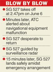 SG 527 was then completely guided back to the runway by the surveillance radar. The pilot was first told to turn in a particular direction, then asked to lower height and decrease speed as directed by the radar. The aircraft landed just after 3pm, amidst all emergency arrangements.
