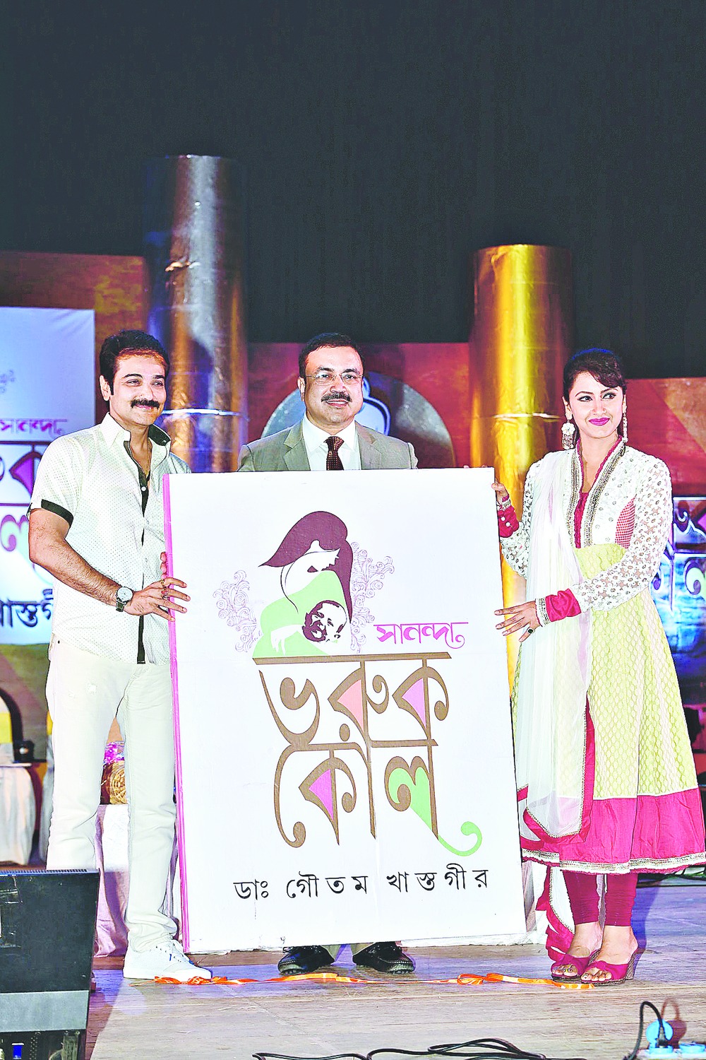 Gynaecologist Gautam Khastgir flanked by Prosenjit and Rachana Banerjee at the launch of Bhoruk Kol, a book on infertility co-published by Sananda. Khastgir