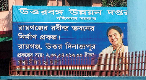 The flex had been put up near the Rabindra Bhavan opposite Raiganj railway station. The auditorium was inaugurated by the chief minister from Calcutta last month.