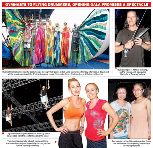 There are some IPL veterans in the fold, too. Three of the stilt walkers had performed at the Bangalore opening ceremony, while Xander Nichting had composed music for four out of the previous five IPL shows.