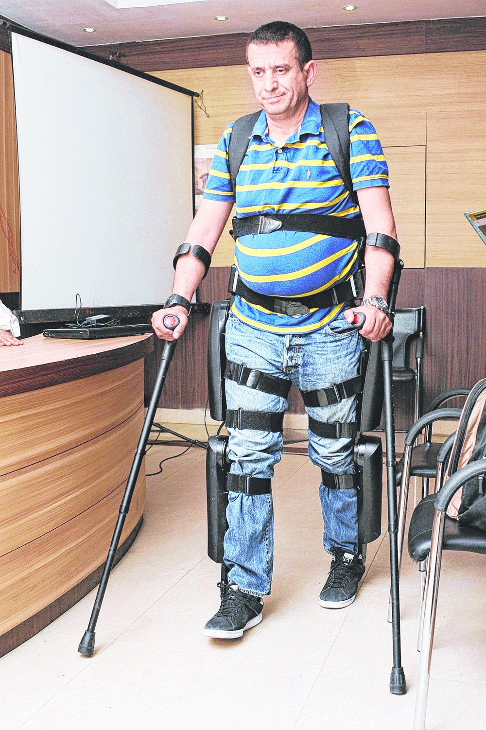 "The bullet had severed one of the bones in my spinal cord. I spent eight months in hospital and spent 19 years after that in a wheelchair. I never thought I would be able to walk again," said Kaiuf, now 46, and in Calcutta to demonstrate how the ReWalk works.