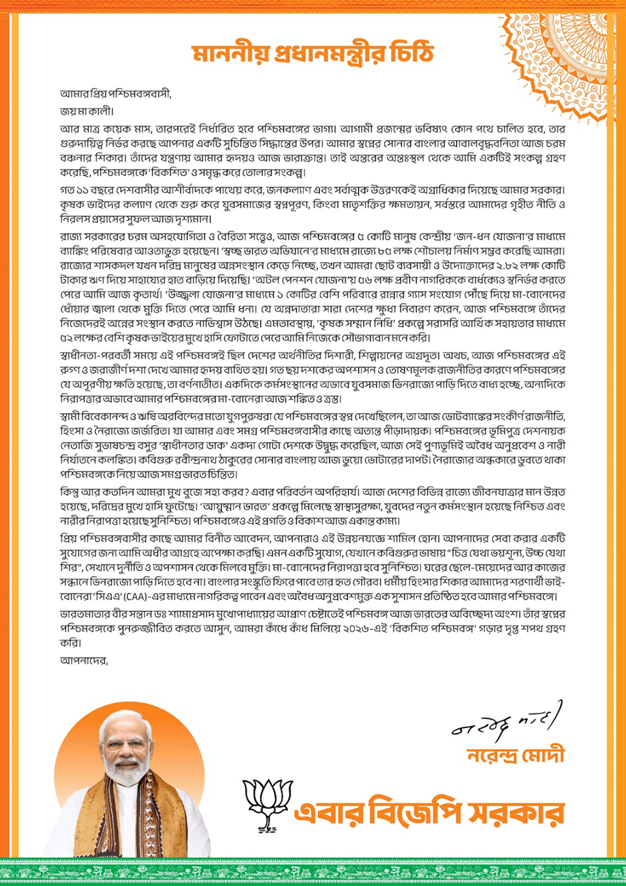 “What will be the fate of the youth of Bengal will be decided in a few more months. Your decision will decide their fate. The men-women-children of Bengal are deprived. I have taken a pledge to make Bengal “bikoshito” [developed] and prosperous,” Modi wrote.