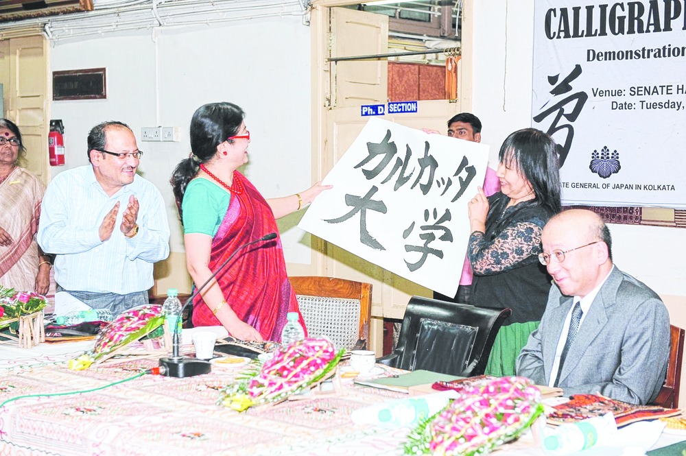 The guests included CU vice-chancellor Sugata Marjit, pro vice-chancellor for business affairs and finance Sonali Chakravarty Banerjee, registrar Basab Chaudhuri, Japan consul-general Kazumi Endo, vice-consul of the cultural department Maiko Morita, and a calligraphy teacher from Japan, Hiroko Nagahama.