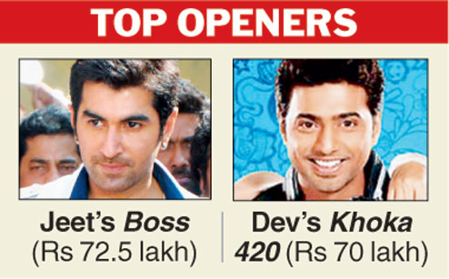 Move over Shah Rukh Khan vs Salman Khan, it’s Jeet vs Dev in Bengal. Jeet’s Boss (Rs 72.5 lakh) has beaten Dev’s Khoka 420 (Rs 70 lakh) record for highest opening-day collections by a Bengali film.