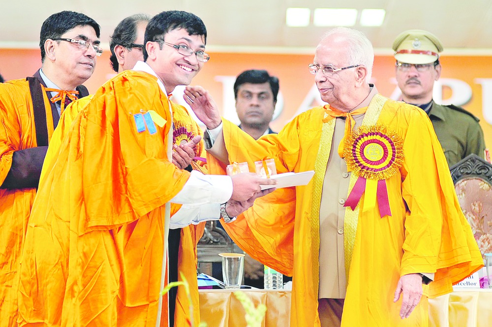 Students queued up in the open-air theatre to take their medals from the chancellor, governor Keshari Nath Tripathi. Many of them touched his feet.
