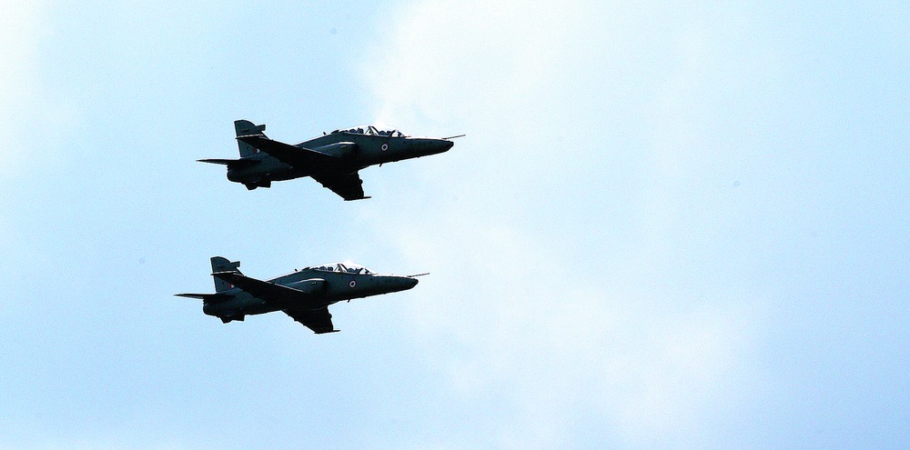 Two Hawk fighter jets take part in an air show at Kalaikunda in West Midnapore on Monday.