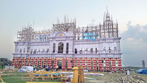 The look: A temple from Mohenjodaro is taking shape here. The pandal will recreate the mound around the temple and actual wheatgrass has been sown to get the desired effect. The puja will be inaugurated on November 8.