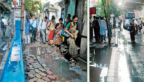 The arterial road that connects Park Circus and Hastings is choked throughout the day despite the AJC Bose Road flyover being built in 2005 to ease traffic congestion. Even a short spell of rain like the one on Monday is enough to create large puddles by the side of the road and on the footpath, where chunks of interlocking tiles are missing. The rest of the footpath, of course, is hawker territory.