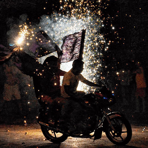 | By 9.30pm, hundreds had gathered on the road clad in purple T-shirts and holding KKR flags. They had their eyes glued to the nearest TV screen inside restaurants and coffee shops. When the moment arrived, fireworks began, the honking started and the victory slogan — “Kay…Kay…Aar, Kay…Kay…Aar” — filled the air. “I was confident. So I bought crackers from Nungi near Budge Budge,” said Bibek Das, a Class XII student and a Sarat Bose Road resident. |