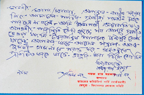 On each postcard, the CPM apologises for failing to meet the voters personally and accuses Trinamul of creating terror and not allowing the Left to campaign. The letter then appeals to villagers to vote for CPM nominees.
