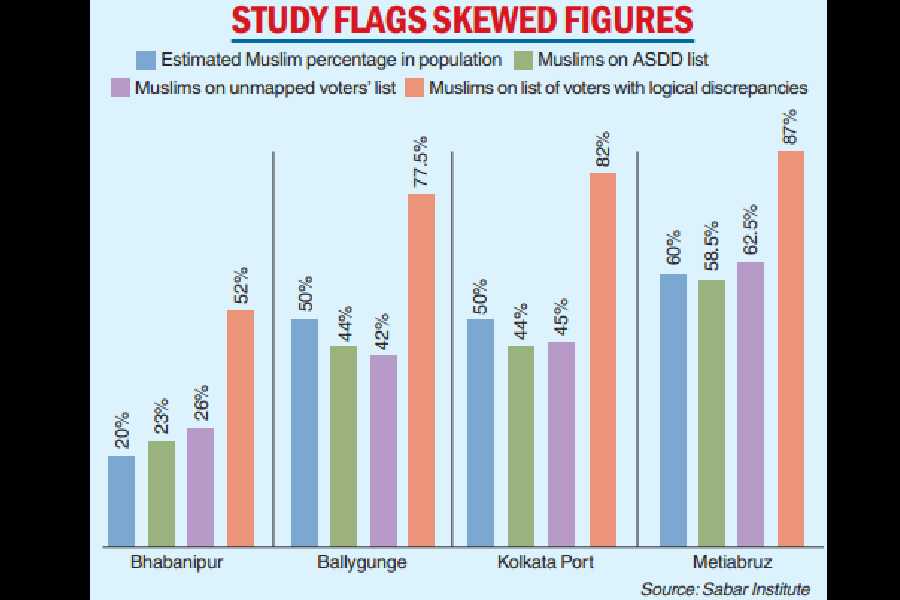 In Bhabanipur, the Assembly seat represented by chief minister Mamata Banerjee, Muslims constitute 20% of the population. The Muslim share in the December 16 ASDD list was around 23%, while the share in the unmapped voters’ list was around 26%. However, the list of voters identified with logical discrepancies shows a Muslim representation of 52%.
