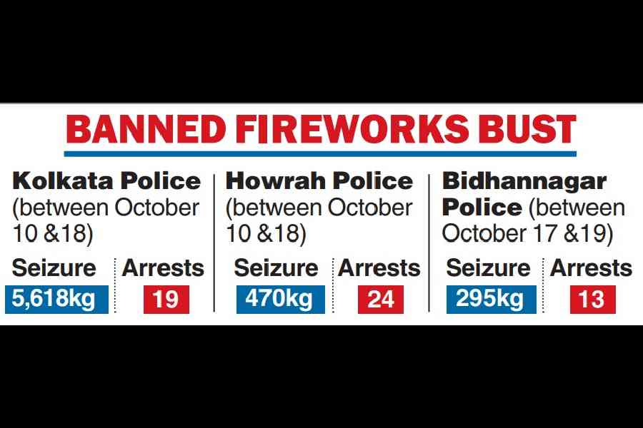 More than 6,000 kg of banned firecrackers have been seized from across Calcutta, Salt Lake and Howrah in around a week before Diwali.