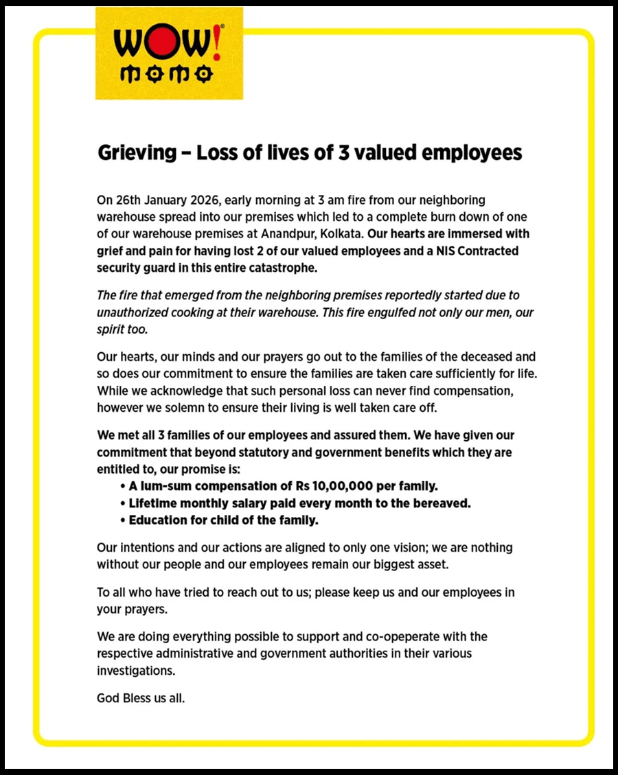 Food chain Wow! Momo on Wednesday said it was “immersed with grief and pain” after the loss of two of its employees and a security guard in the fire at Anandapur in east Kolkata, announcing financial compensation and lifelong monetary support to the affected families.