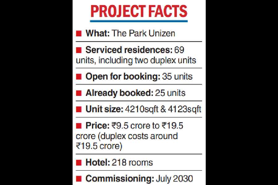 The residences at The Park Unizen will be housed in two towers. Prices range between ₹9.5 crore and ₹19.5 crore, including taxes and car parking, an Ambuja Neotia official said. A third building will house a hotel with 218 rooms.