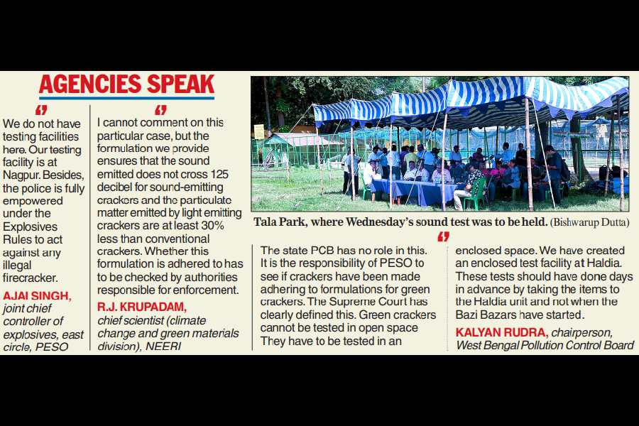 Ajai Singh, joint chief controller of explosives (east circle) at PESO, confirmed that the agency lacks the equipment to conduct field tests in Calcutta. “Our testing facilities are in Nagpur. We couldn’t have conducted the test at Tala Park on Wednesday,” he said.
