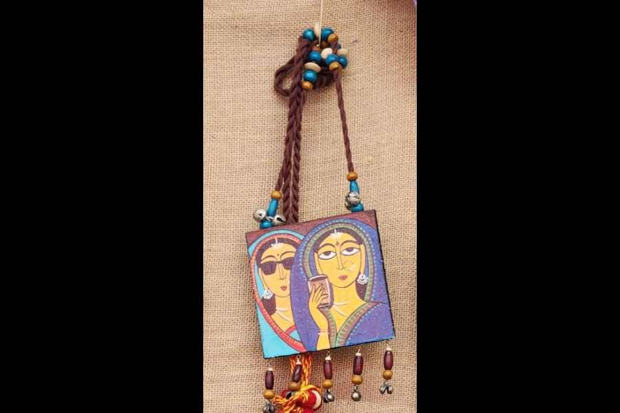 Stall: Kallolini Kolkata 21 This stall gives the classic Jamini Roy style a quirky twist — characters wearing sunglasses or hold cocktail glasses, a priest in traditional attire working on a laptop…. “Everyone loves Jamini Roy art but I thought of giving it a contemporary touch without changing the signature style,” said Ruma Koley Price: Rs 420 for a necklace and earring set