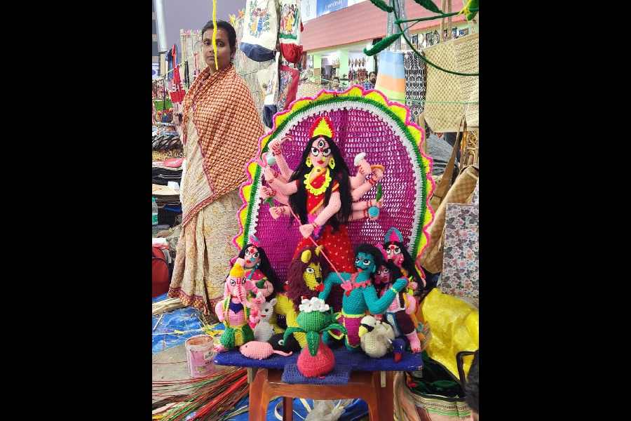 Stall: Opposite Mela Office Most items in this crochet stall are on the lines of flowers and mats but the jewel in its crown is a large pantheon of Durga’s family, also in crochet. “I enjoy making these, and this Durga is one of the most challenging pieces. It takes me a month to make,” says Subodh Barma, the artisan from North Dinajpur. “If they sell out at the fair, I have staff who can help me make more quickly,” Price: Rs 5,000