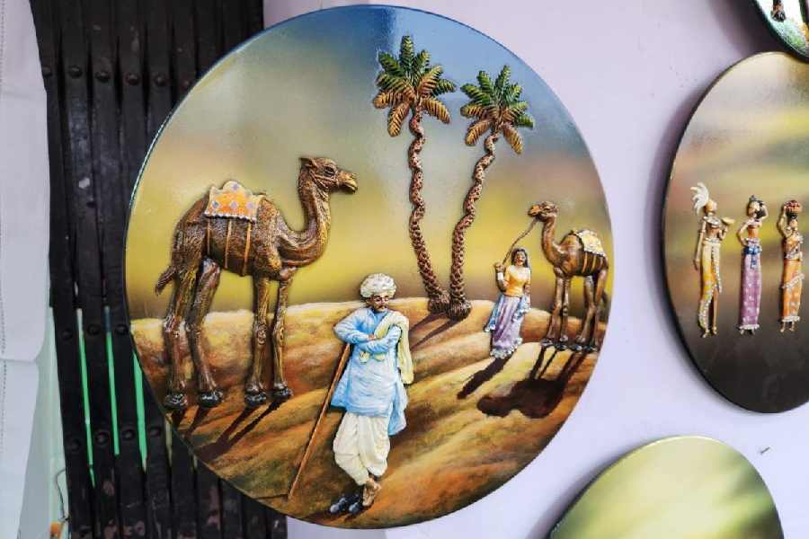 Stall: Hooghly These artworks are made on MDF (mediumdensity fibreboard) boards, polished, and finished with poly-fibre — a liquid resin that creates a raised, glossy, mural-like effect. Additional chemicals make the pieces durable. “Motifs range from rural scenes to deities, and Jagannath sells the most. My Jagannath collection sold out on Sunday and I have had to replenish stocks from my studio. Durga and Rama are popular too,” says Shyamal Adhikary. Price: Rs 400–5,000
