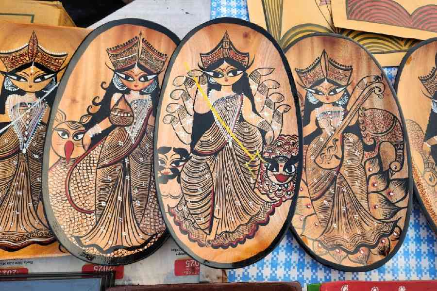 Stall: Opposite Patachitra Shilpa 1 These come in oval or rectangular wooden bases with Durgas in various poses painted in a charming, playful style. “I’m a patachitra artist, but there are many of us here creating similar work, so I thought of trying something new. This is my own style — heavily influenced by patachitra, but with my own interpretation of the goddess,” says Parul Chitrakar from West Midnapore. Price: Rs 700