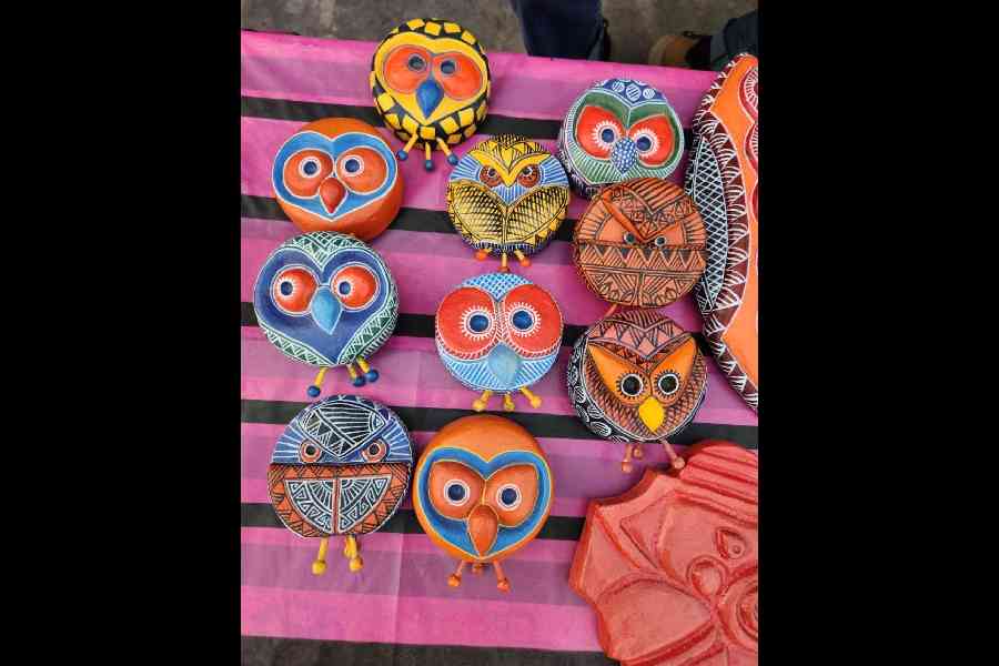 Stall: Lane opposite Ichhamati These pieces look like heavyweight terracotta, but are surprisingly light. “They’re made of sawdust and wood dust,” said the artisan who goes by the moniker Madhukari Pheriwala. “We buy dust from sawmills, sieve it, mix the fine dust with glue and water for texture and knead it. It is then shaped with claymodelling tools. It’s very sturdy and, in fact, I’m ready to offer a prize to anyone who can break it.” He sells table stands and wall hangings in motifs of owls and tribal art. Price: Rs 300–800
