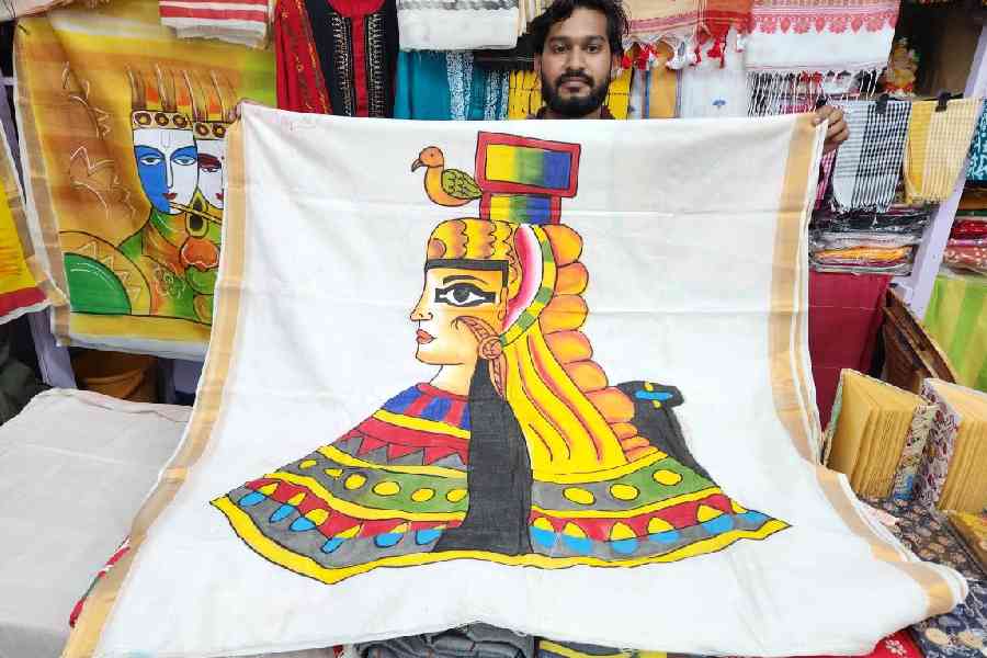 Stall: Damodar 8 This stall features bold, hand-painted saris. The base is Kerala cotton — off-white with gold borders and embellished with a single large motif on the anchal, such as Cleopatra of Egypt or a Kathakali dancer. “We’ve used acrylic paint for the work, which will not bleed when washed. It is safe to iron too,” says Chanchal Roy from West Burdwan. Price: Rs 1,200