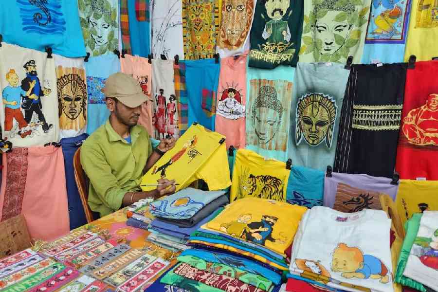 Stall: Karigarer Haat, Pavilion 13 Palash Dey paints T-shirts right in his stall. On display are T-shirts in tribal art forms, like Saura and Madhubani, African masks and Egyptian motifs — but Tintin characters remain the all-time crowd favourite. “We have sizes ranging from age three to chest size 48,” he says. Price: Rs 250–2,000