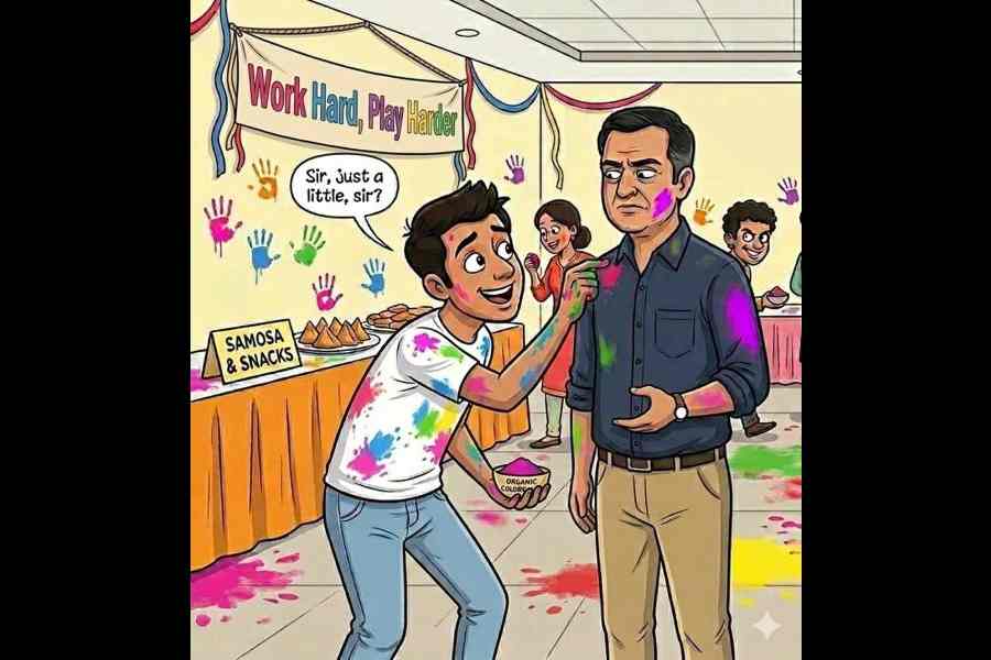 Take Anirban from Accounts. Dressed in an aggressively white kurta clearly purchased for the sole purpose of being “accidentally” smeared by senior management, he stationed himself strategically near the entrance. The moment the boss arrived, Anirban lunged forward with a delicate pinch of pink abir and an even more delicate: “Sir, just a little, sir?” He ensured the colour touched only the boss’s cheekbone — respectful, yet visible enough for social media documentation.