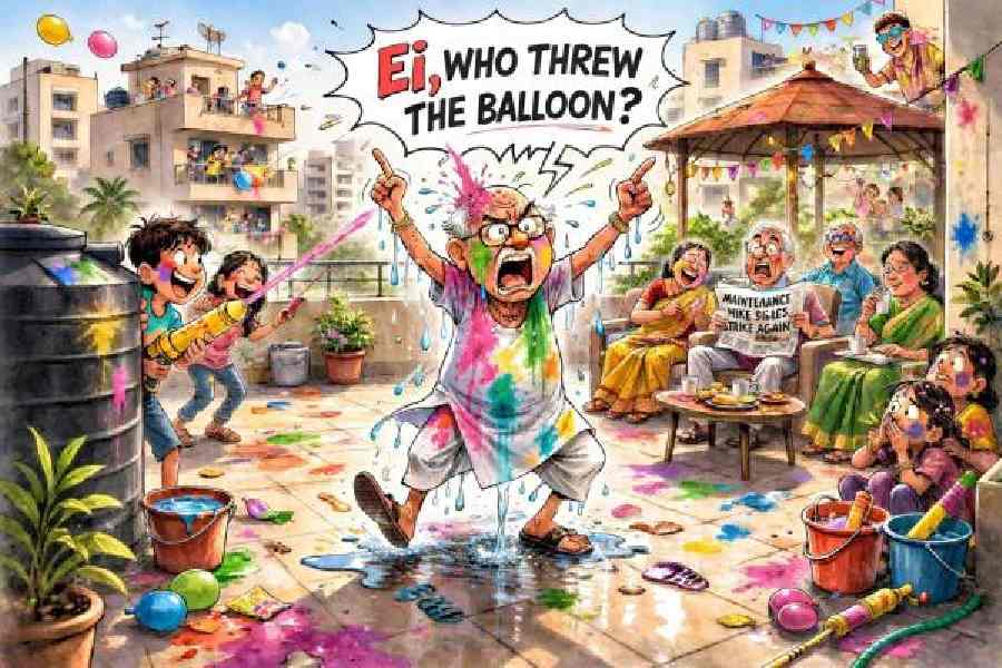 This year’s first casualty was Mr Ghosh from Flat 5D, who had merely stepped onto the terrace to check the water tank. A balloon meant for his teenage grandson, who came accompanying him, landed squarely on his bald pate. There was a stunned silence. Then came the inevitable roar: “Ei! Who did this?” The guilty parties scattered like pigeons.