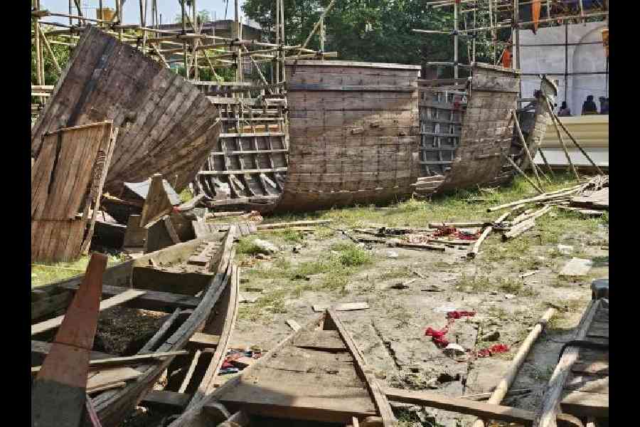The look: MLA Taposh Chatterjee’s club focuses on the makers (Rupokar). Visitors walk in by a factory shed forming a part of the facade to reach a pathway by which a huge boat is being built. Further up, beside the pandal, a wavy riverscape has been created with mats of bamboo slices. Sailing on it are seen some smaller boats. In front of the installation, there are tin sheds where a market has come up by the river. The idol itself will be half-done and some idol-makers will be in the process of making it while a small idol will be worshipped.