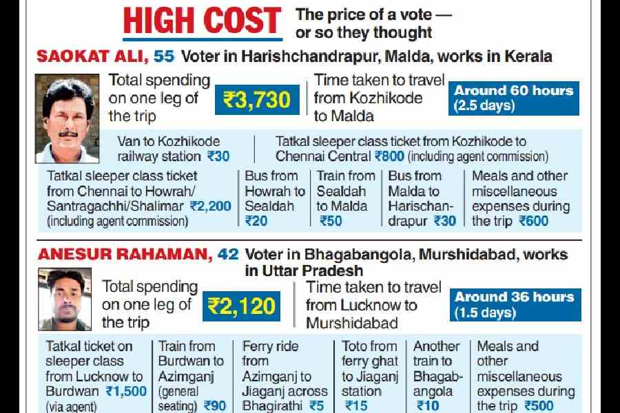 Samirul Islam, Trinamool Rajya Sabha MP and head of the West Bengal Migrant Workers Welfare Board, said the scale of the crisis is difficult to assess due to the unorganised nature of migrant labour. “For these workers, no work means no pay. Not only have they been forced to spend heavily on travel, they continue to lose income while trying to reclaim their voting rights,” he said.