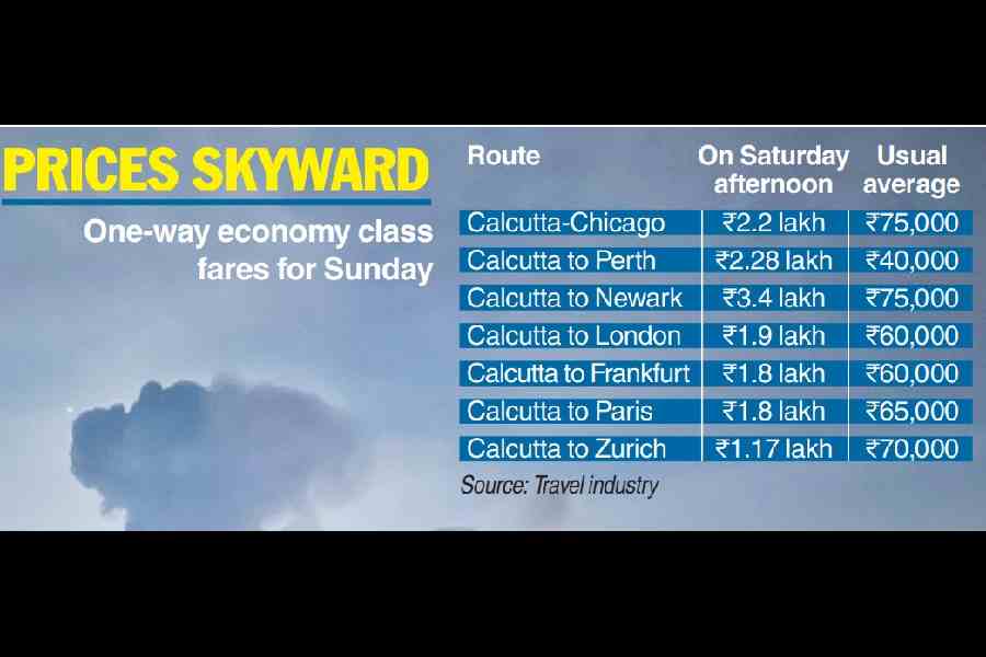 An economy ticket to Newark for Sunday was ₹3.33 lakh with two stops. By Saturday evening, tickets on another airline for the same route were nearly ₹10 lakh. Travel agents said that even expensive fares between Calcutta and Newark normally range between ₹75,000 and ₹80,000 one way.