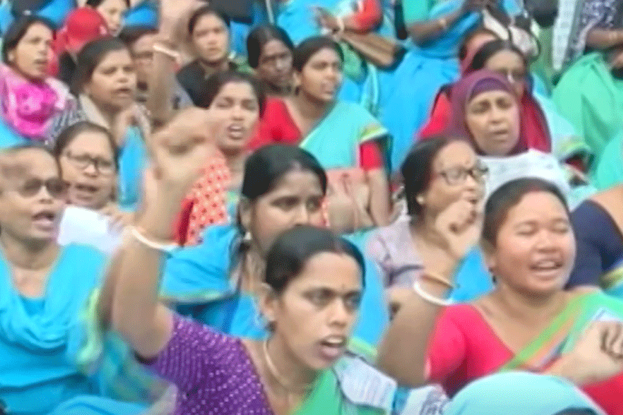 Members of the West Bengal Anganwadi Workers and Helpers Welfare Association began a three-day sit-in near the Shaishali complex, headquarters of the social welfare department.