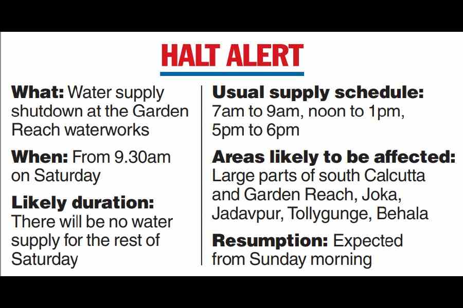 Water supply will be disrupted across large parts of south Calcutta on Saturday as the Garden Reach waterworks will be shut from 9.30am to carry out repairs in the supply network.